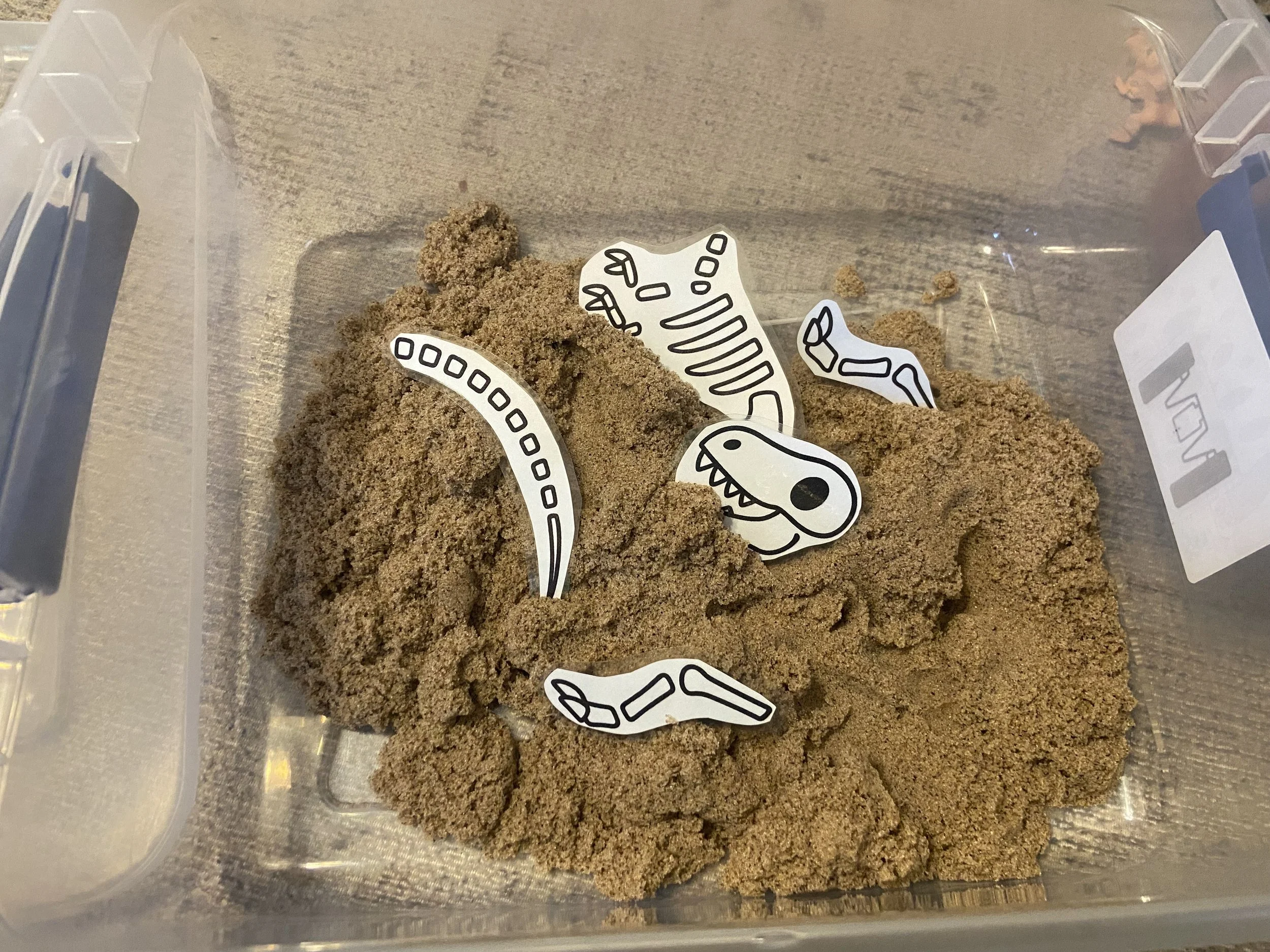 Bury the bones or toy dinosaurs under the kinetic sand in your bin. Make sure some are deeper and some are closer to the surface for a more exciting discovery.Set up the dig site.