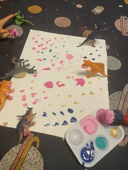 Gently press the feet of the toy dinosaurs into the paint.Stomp, walk, and drag!